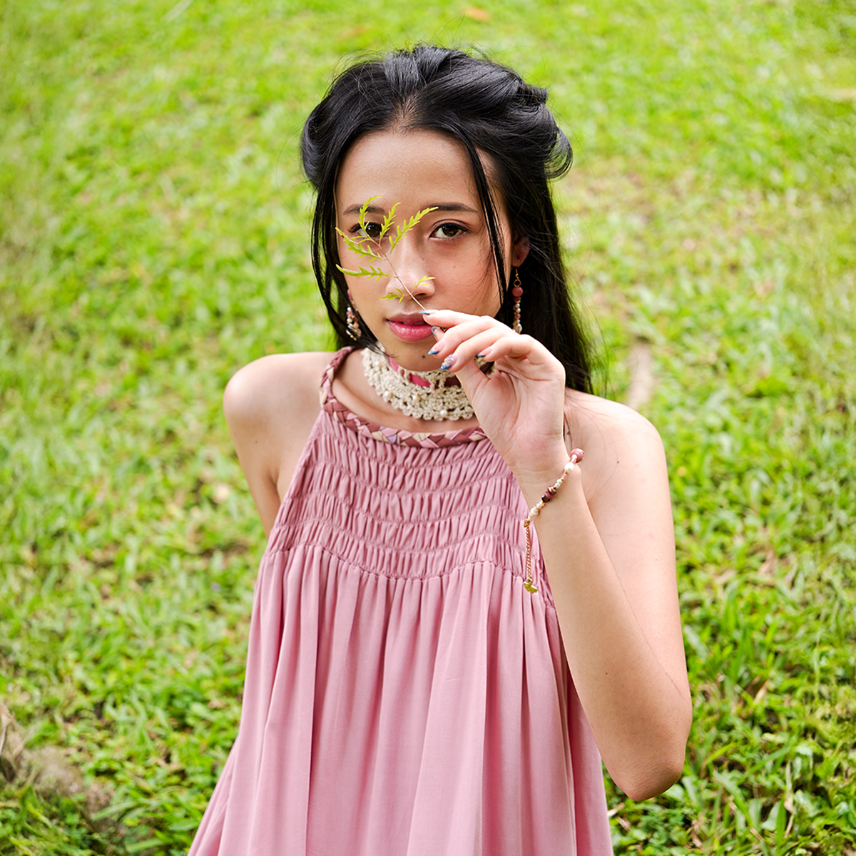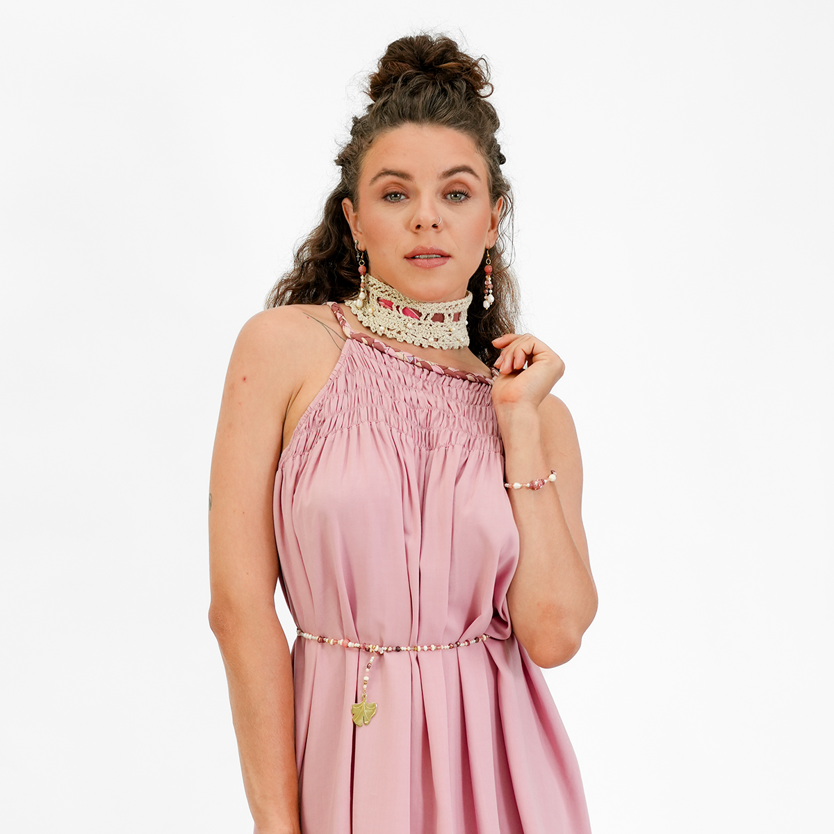 These chokers were designed by Balizen and are handmade by a group of women crocheters in the mountains of Bali. They are made with silky soft rayon yarn and then intricately beaded with fresh water pearls, little crystal & onyx beads. The choker is threaded through with a ribbon made from our onyx print rayon and closes by tying the ribbon in the back, making it very adjustable.